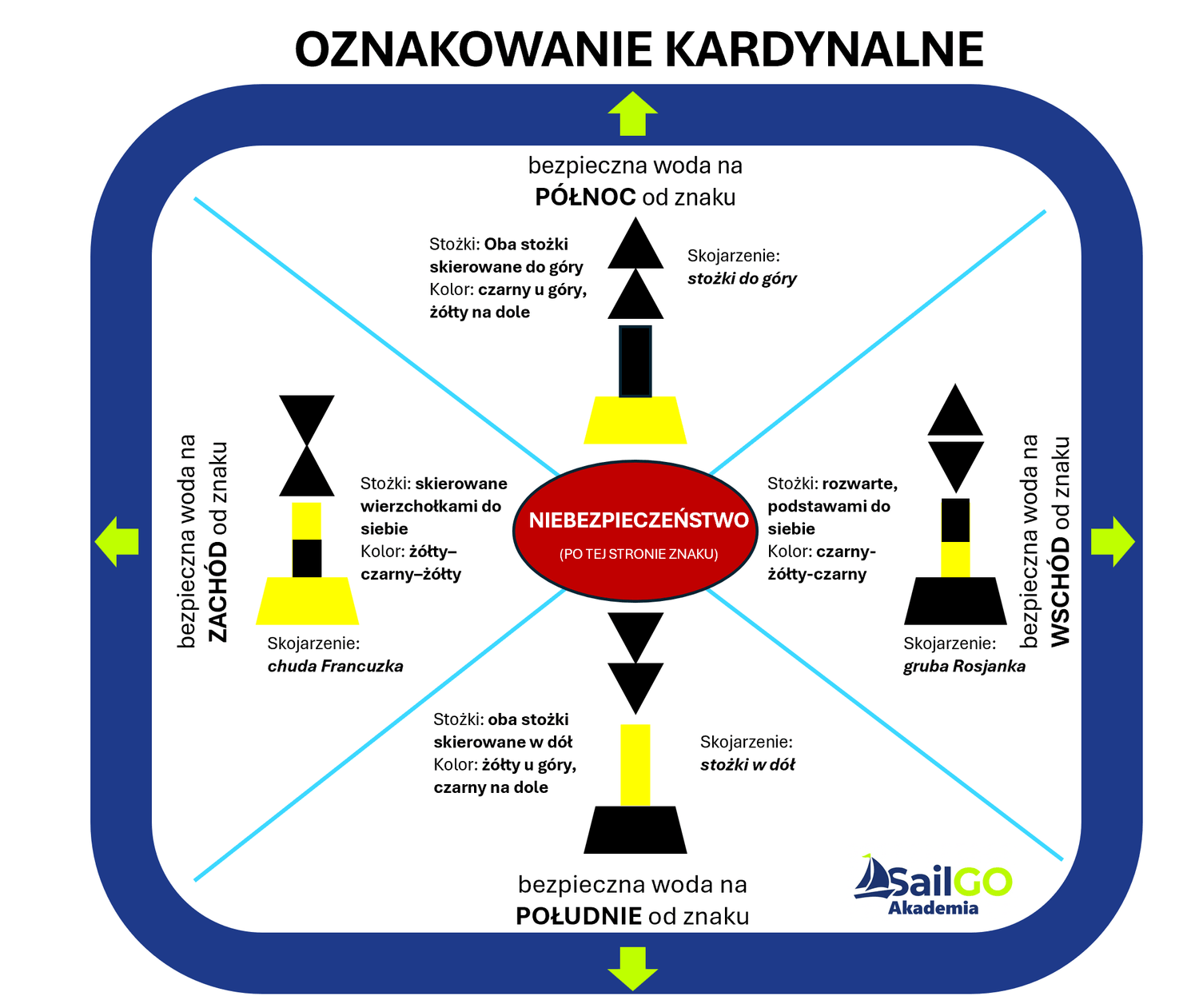 Ważne jest też, że znaki kardynalne raczej nie występują pojedynczo, a to oznacza, że jak wiedzę jeden to gdzieś jest drugi, a jak widzę i drugi i trzeci, to mogę sobie lepiej wyobrazić akwen, który jest niebezpieczny. Bo prędzej czy później zobaczę też czwarty znak.