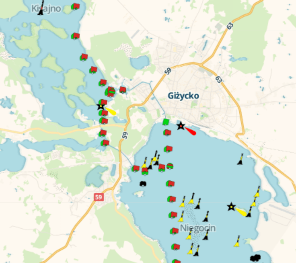 Dobrą pomocą jest też oficjalna mapa Wielkich Jezior Mazurskich, zgodna z GPS, która pokazuje nie tylko oznakowanie IALA, ale też kamienie, miejsca niebezpieczne, rozgałęzienia szlaków, linie energetyczne czy maszty systemu ostrzegania pogodowego. To nie jest gadżet dla pasjonatów locji. To jest bardzo praktyczne narzędzie, zwłaszcza gdy planujesz trasę po większych jeziorach.