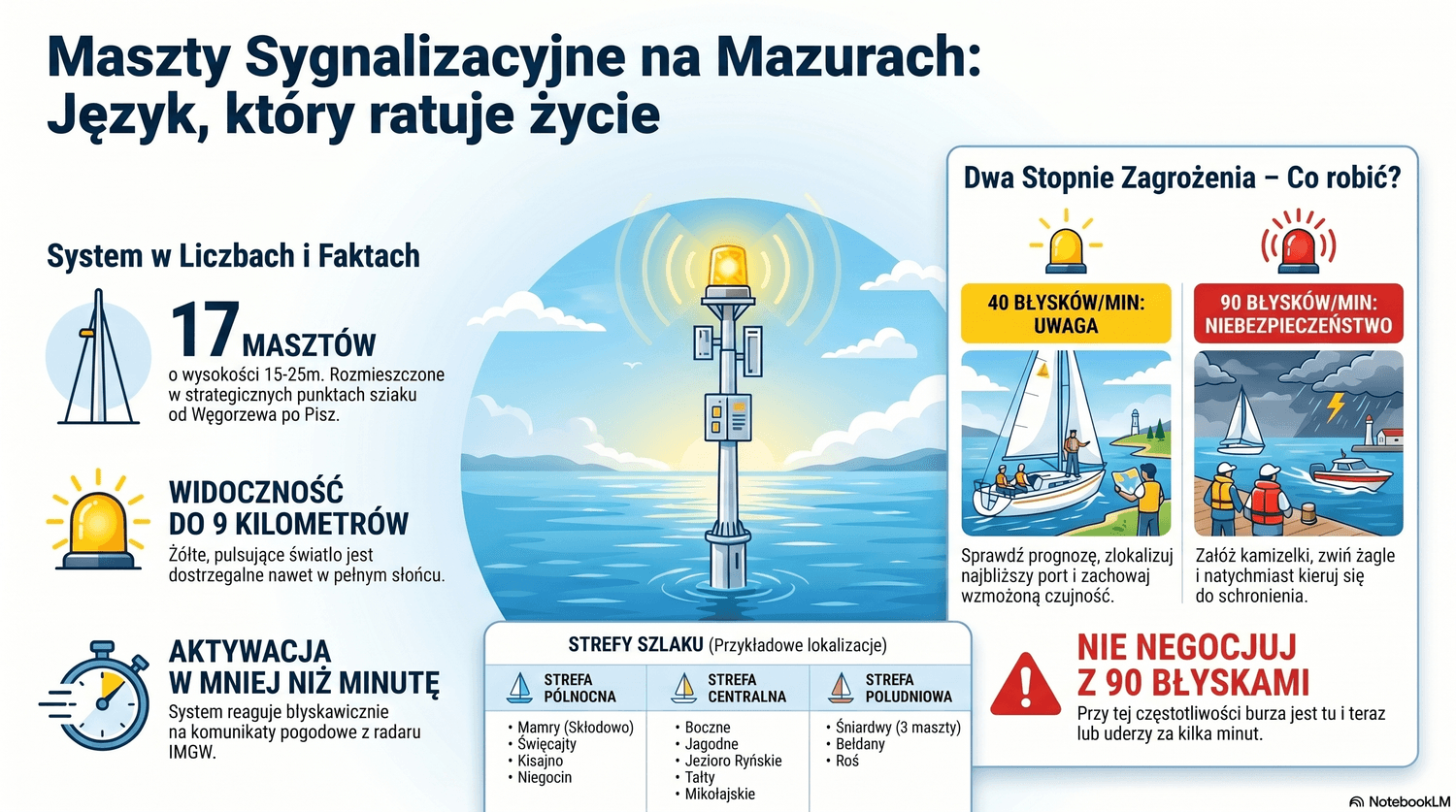 Każdy żeglarz, który spędził na Mazurach choć jeden sezon, widział je z daleka to wysokie konstrukcje z głowicą, panelem słonecznym i małą turbiną wiatrową, postawione w strategicznych punktach szlaku. Większość ludzi przepływa obok, nie wiedząc, czym dokładnie są. A te maszty potrafią uratować życie, ale tylko jeśli rozumiesz po co są i dlaczego świecą.