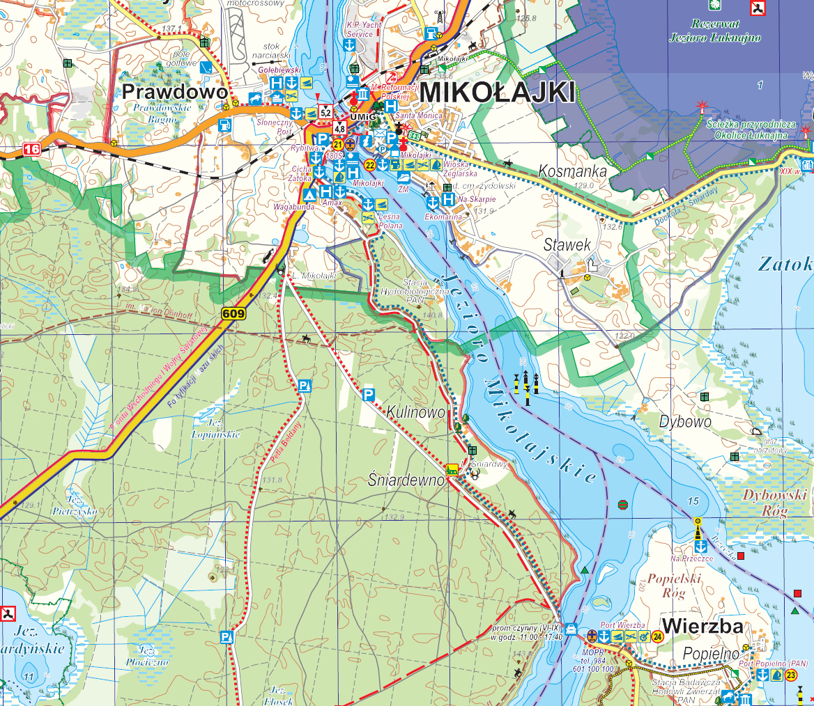 Lokalizacja: Środkowa część szlaku; na północy łączy się pod mostami w Mikołajkach z jeziorem Tałty, na południu z jeziorem Bełdany oraz przez Przeczkę ze Śniardwami.
