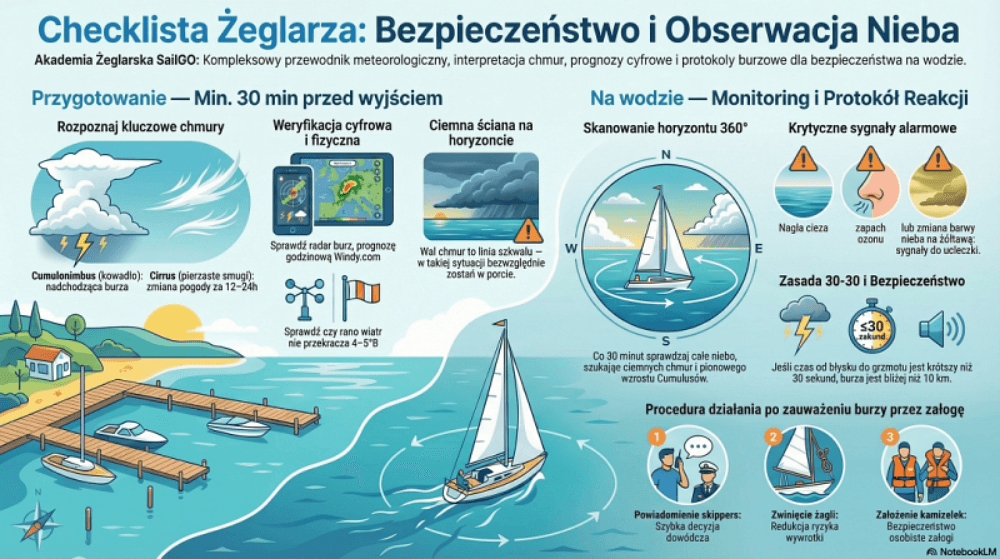 *Uwaga: ta checklista to szybka, obrazkowa pomoc przed wyjściem na wodę. Nie zastępuje samodzielnej oceny warunków, obserwacji nieba, sprawdzenia prognozy ani rozsądnej decyzji sternika.